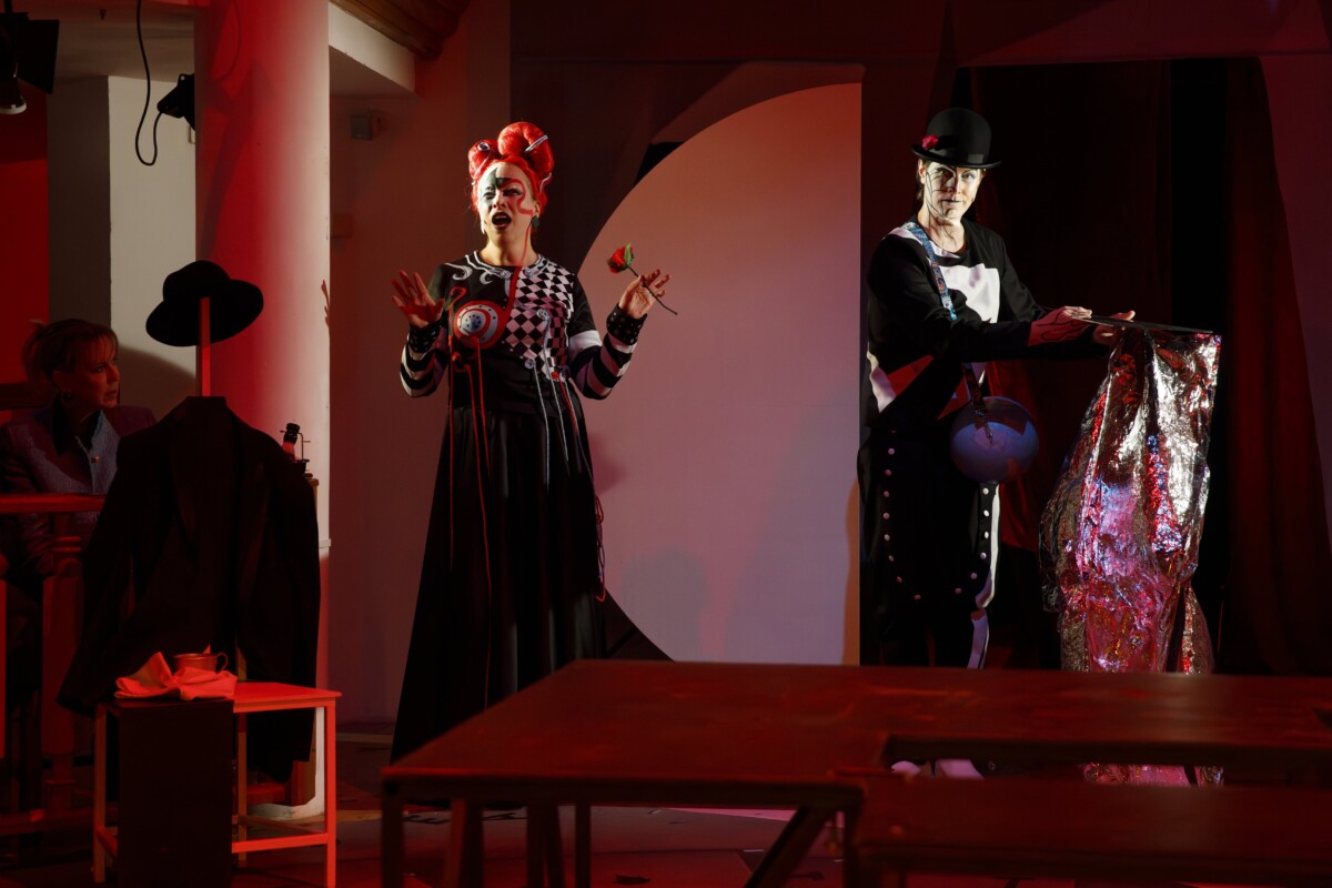 На сцене яркие и красивые: Таська в оранжевом платье и с жёлтыми цветами – здесь вдумчивый зритель сразу уловит отсылку к «Мастеру и Маргарите» – и совсем юный студент Михаил Булгаков. С первых сцен зрители перемещаются в начало прошлого века и вовлекаются в шекспировский накал страстей — родители молодых не дают разрешения на брак, и пока ещё не писатель, а просто Миша задумал стреляться: актёры глубоко и страстно погружаются в свои образы и проживают их перед зрителями.