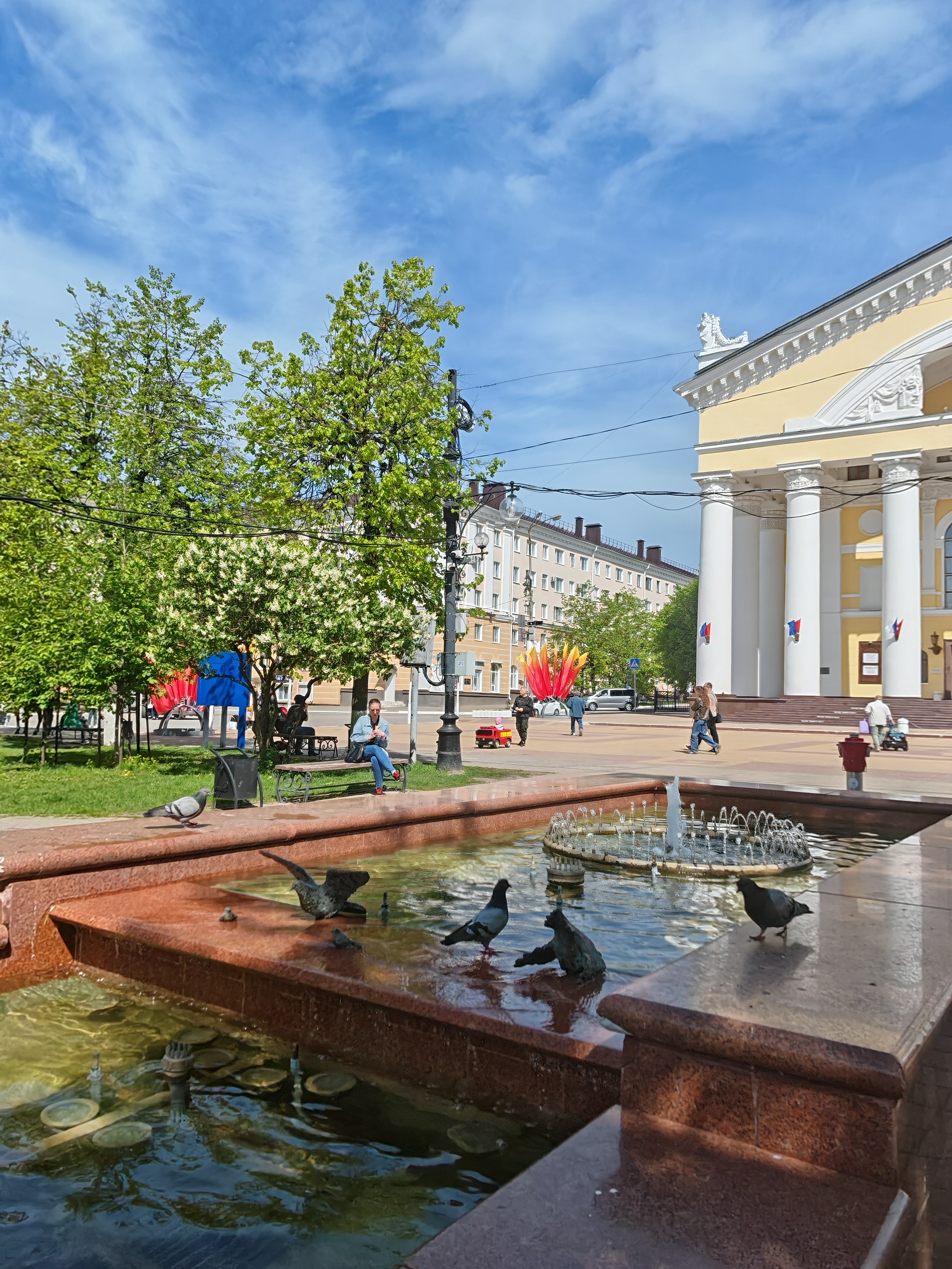 По дороге к театру — фонтан с бронзовыми голубями (если не знать об этом, можно подумать, что голуби настоящие): они пьют воду и плещутся в ней. Очень интересная и классная идея — и не единственная… Например, по всему городу разбросаны маленькие фигурки космонавтиков, и это неудивительно, потому что Калуга — космическая столица нашей страны.