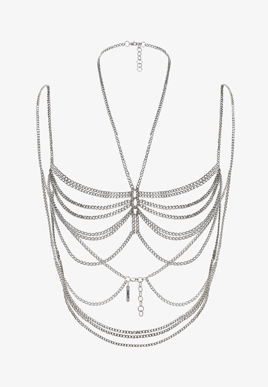 Когда мы говорим о серебряных украшениях, в голове обычно всплывает самый стандартный набор: кольца, серьги, подвески и колье. Однако современные модные веяния дают нам широкий простор для экспериментов. Поэтому будущей подружке невесты также рекомендую присмотреться к брутальной цепочке на тело Tale, которая в одиночку решит вопрос всех украшений для торжества. Такая яркая акцентная деталь будет выигрышно смотреться на однотонном атласном или шёлковом платье в пол и однозначно выделит вас из общей массы гостей.