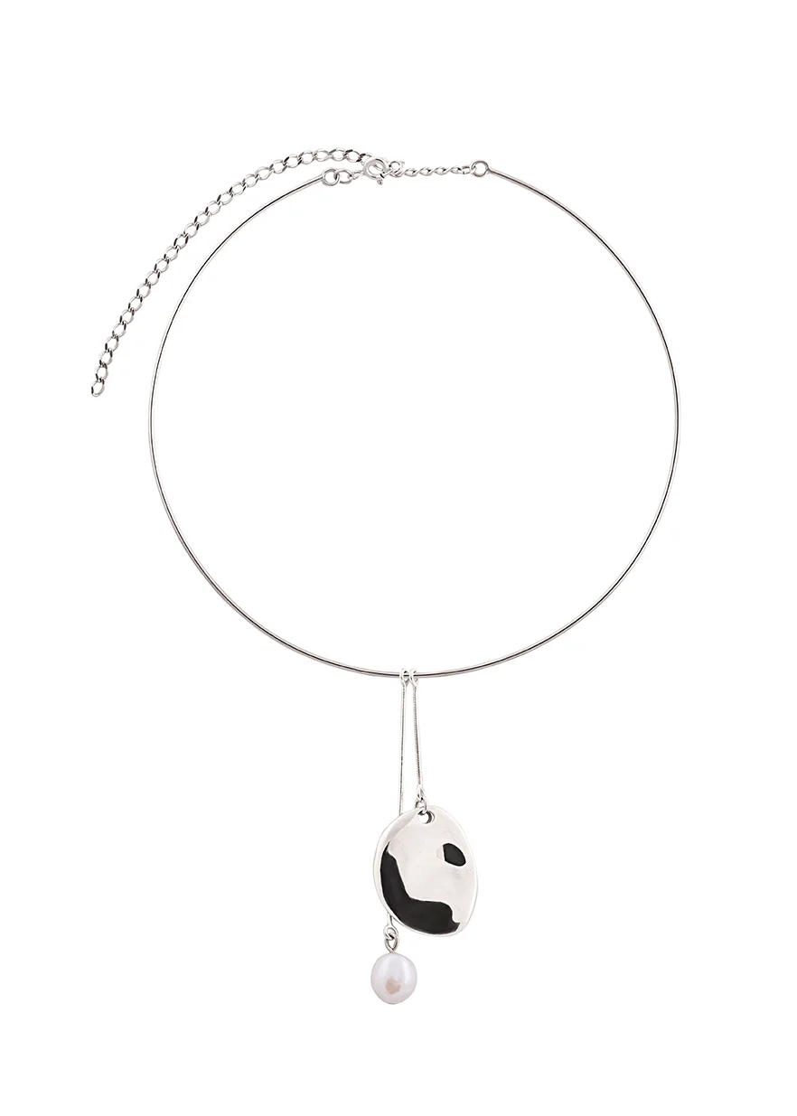Серебряное колье-чокер с жемчугом от Qari Qris под названием «Тифлис» сочетает в себе чёткие линии и мягкие природные изгибы. Крупная барочная жемчужина придает ансамблю легкости и нежности, а гладкий зеркальный медальон, созданный вручную, будто застыл в руках мастера, приняв уникальную, «неправильную» форму.