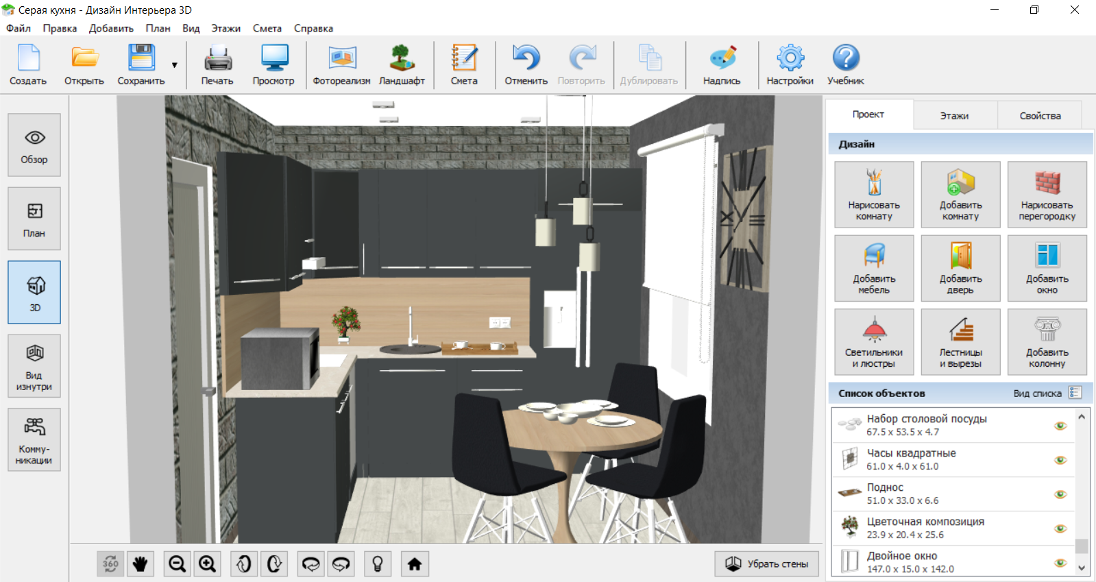 Одним из таких планировщиков является Дизайн Интерьера 3D. В нём можно не только продумать внешний вид помещения, но и разработать схему разводки коммуникаций, составить смету и создать фотореалистичные рендеры. В программе есть обширная библиотека на 600+ моделей мебели и 1300 текстур. Если имеющихся материалов недостаточно, можно загрузить собственные в виде обычных картинок формата JPEG или BMP.