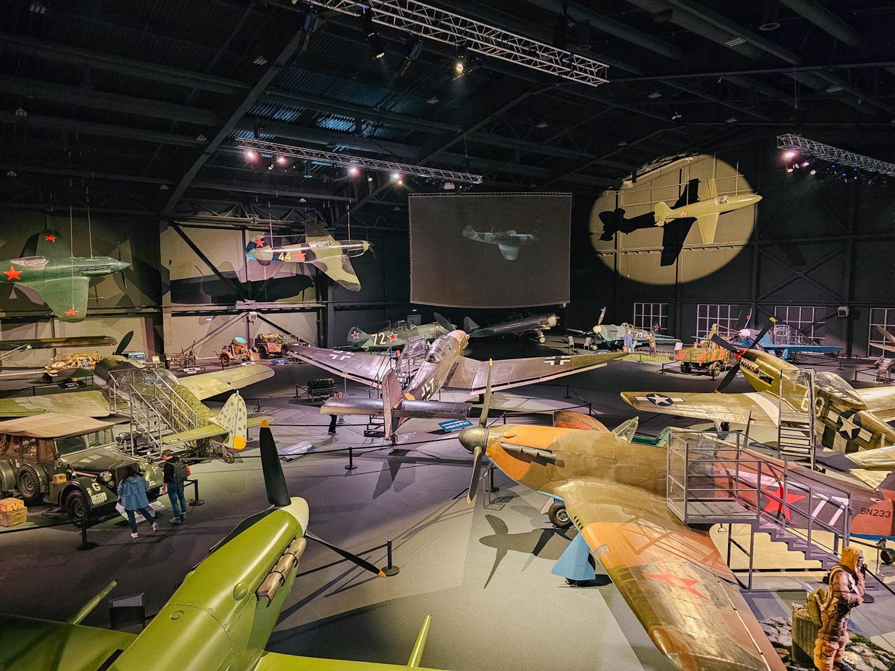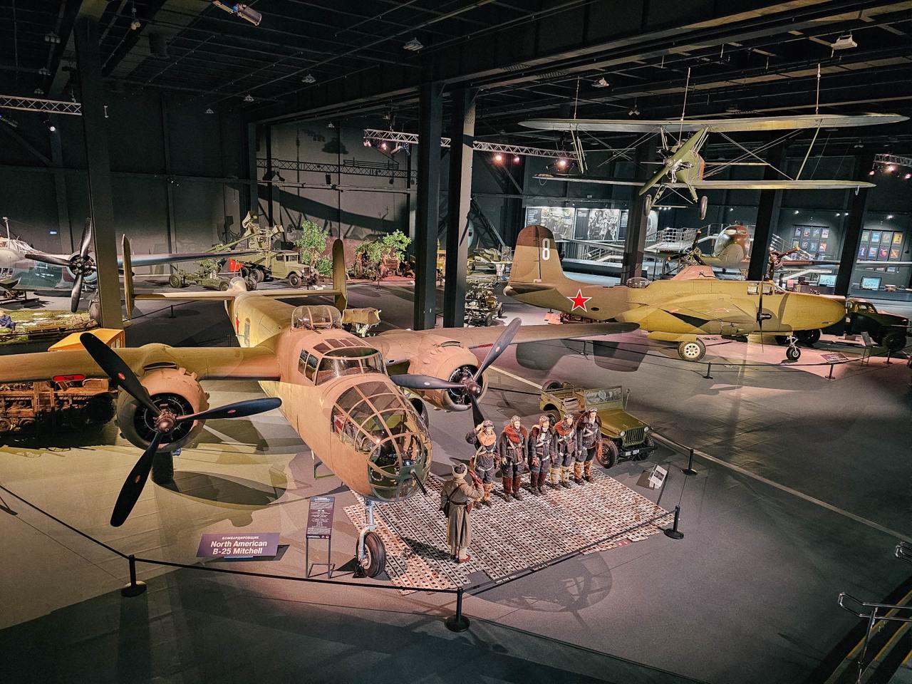 Здесь можно увидеть не только советские самолёты, но и машины, доставленные в СССР по программе ленд-лиза: истребители Bell P-39 Airacobra, P-51 Mustang, Hawker Hurricane, бомбардировщики Douglas A-20 Boston, North American B-25J Mitchell, транспортный Douglas DC-3, а также самый крупный экспонат — американскую летающую лодку PBY Catalina.