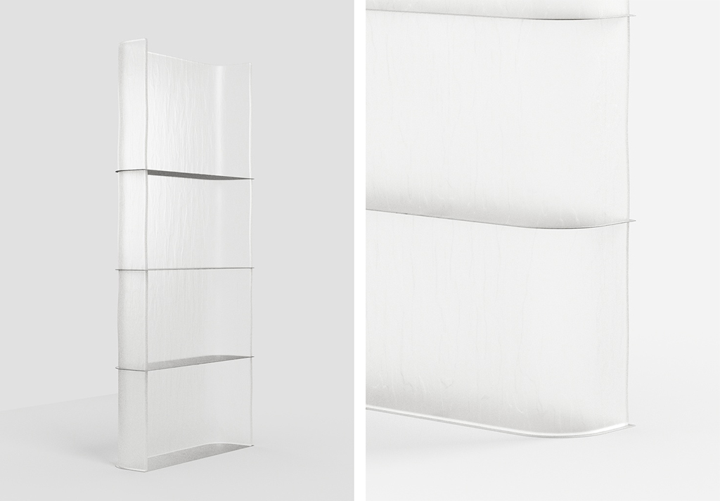 Впервые вниманию публики будет представлен модульный стеллаж CALMAR — объект, растворяющийся в пространстве подобно миражу. Его бархатистая поверхность манит, приглашая обнаружить грань между материальностью и иллюзией.