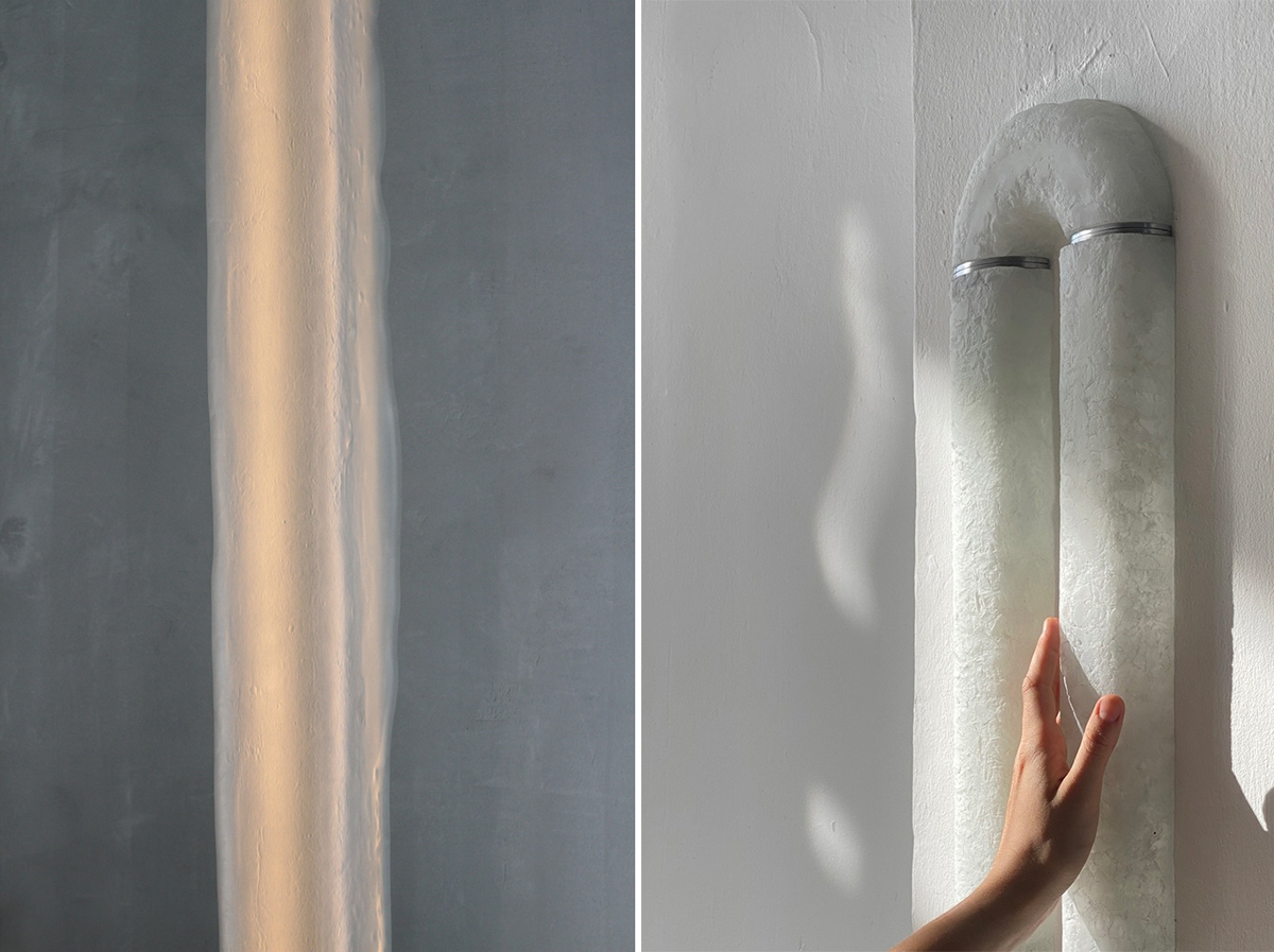 Название коллекции отсылает к редкому атмосферному явлению — световому столбу, когда над источником света возникает вертикальная колонна свечения. Внутренний свет, проходя сквозь толщу матового стекла, подсвечивает его текучие края, создавая эффект мягкого внутреннего свечения и делая каждый объект похожим на застывший световой луч.
