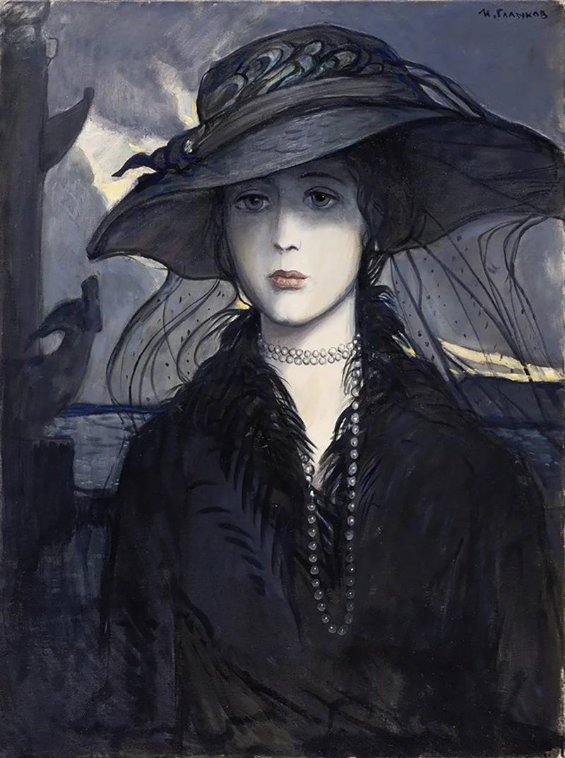 На фоне этих монументальных и философских полотен особенно выделяется работа «Незнакомка» (1982), показывающая другую грань таланта Глазунова. Жемчужина блоковской поэзии воплотилась в его иллюстрациях символом вечной женственности, обретя таинственные черты романтического образа. Однако Глазунов уходит от буквальной иллюстрации стихотворения, создавая собственный многогранный и психологически насыщенный портрет. Художник переносит образ из условного мира символизма в узнаваемую, но оттого не менее загадочную атмосферу города Достоевского.