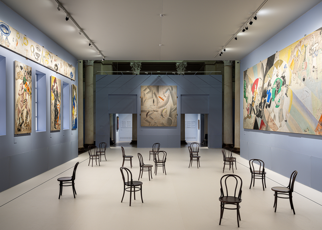 В пространстве зала панно с обилием бытовых деталей соседствуют с более условными, метафоричными композициями, созданными на рубеже 1920-х годов. Особое место занимают работы из так называемой «витебской серии» — в них Шагал с теплотой и ностальгией запечатлел близких людей, улочки родного города и пейзажи его окрестностей.