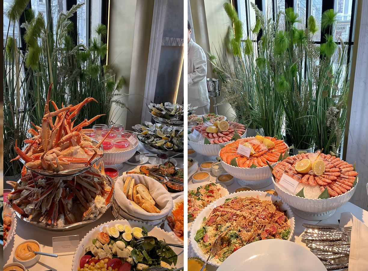 Первый акцент — морская подача: магаданская креветка, сладкая северная креветка, королевская креветка Vannamei, краб опилио, устрицы Хасанская и Императорская. К устрицам подаются лимон и соус из винного уксуса с луком, к креветкам и крабу — айоли с печеным чесноком и биск. Рядом — закуски: паштет из лосося под томатным желе, авокадо с тартаром из лосося холодного копчения, пончики с крабом и соусом манго-айоли, брускетта с копченой треской, брускетта с крабом опилио, пани пури с риетом из копченой трески и щучьей икрой, сашими из лосося, обожженное маслом, севиче из лангустинов в соусе кимчи, спринг-роллы с креветками в соусе том ям, мини-чебуреки с креветками, сливочно-сырное фондю с крабом и креветками, сыры с медом.