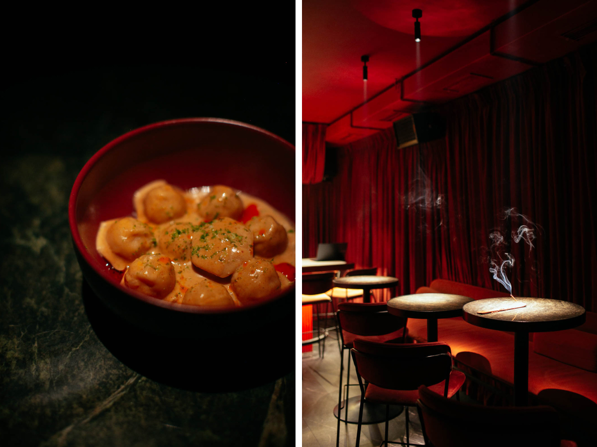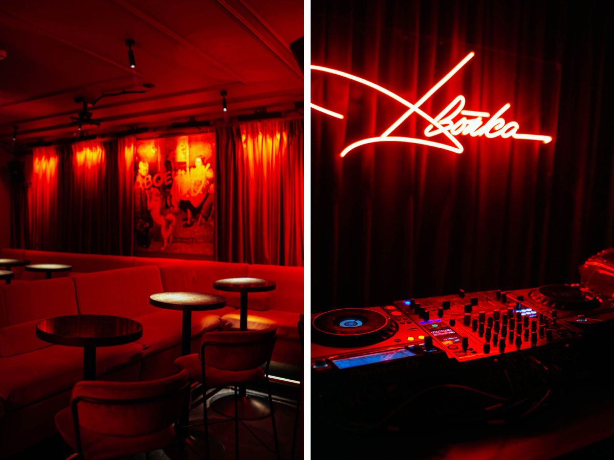 Пару слов хочется сказать об интерьере: это максимально стильное пространство с красными стенами, драпировками и подсветкой. Пара залов, расслабленная атмосфера — всё располагает к отдыху под аккомпанемент диджея.