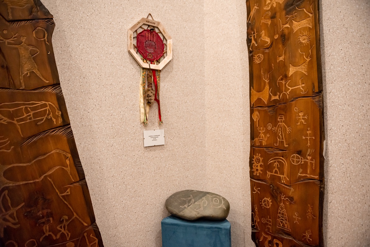 Есть репликах петроглифов, собранных в разных странах мира. На стенах, под стеклом, настоящие денежные купюры, привезенные из всевозможных уголков земного шара. На них сияют отличительные друг от друга солнышки. Присутствуют изображения солнц и на копиях государственных флагов, представленных здесь же.