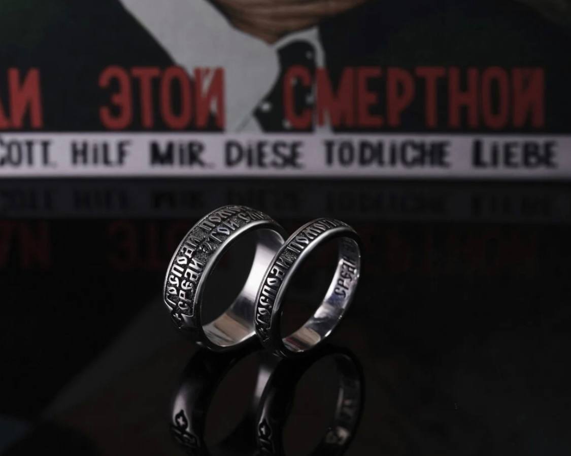 Кольцо стилизованное под церковное “спаси и сохрани”, но с текстом “Господи, помоги мне выжить среди всей этой смертной любви”. Вдохновлено граффити, нанесенным на берлинской стене, изображающим поцелуй Леонида Брежнева и руководителя ГДР Эриха Хонеккера.