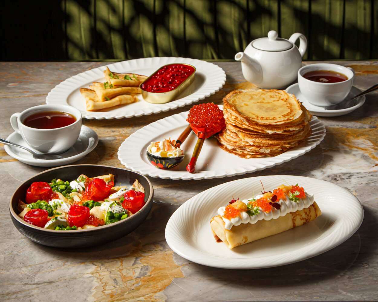 В масленичном меню – традиционные блины со щучьей икрой и сметаной (1200 руб.), а для особого настроения – с черной икрой (2300 руб.). Классику дополняют авторские позиции: блин с говядиной Black Angus, дополненный черным трюфелем и насыщенным соусом жу с белыми грибами (1900 руб.), ажурные блины с нежным камчатским крабом и авокадо (1800 руб.), а также шпинатные блины со слабосоленым лососем и красной икрой (1800 руб.).