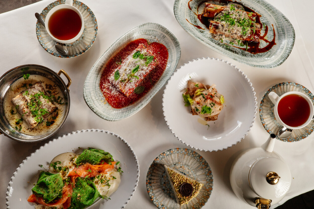 В бистро Marble помимо классических вариантов отдельного внимания заслуживают блины с томлёными говяжьими щечками под медово-грибным соусом (900 руб.) — сытное и насыщенное блюдо, в котором мягкость мяса сочетается с деликатной сладостью и глубиной вкуса. Рыбное ассорти с блинами (900 руб.), а на сладкое — блинный торт с шоколадным кремом (600 руб.) — плотный, нежный и по-домашнему уютный. К праздничному настроению бистро на Никитском бульваре добавляет небольшой комплимент: при заказе любой позиции из специального меню гостям подают на выбор 50 мл водки «Онегин» или 50 мл ягодной настойки «Онегин Gourmet».